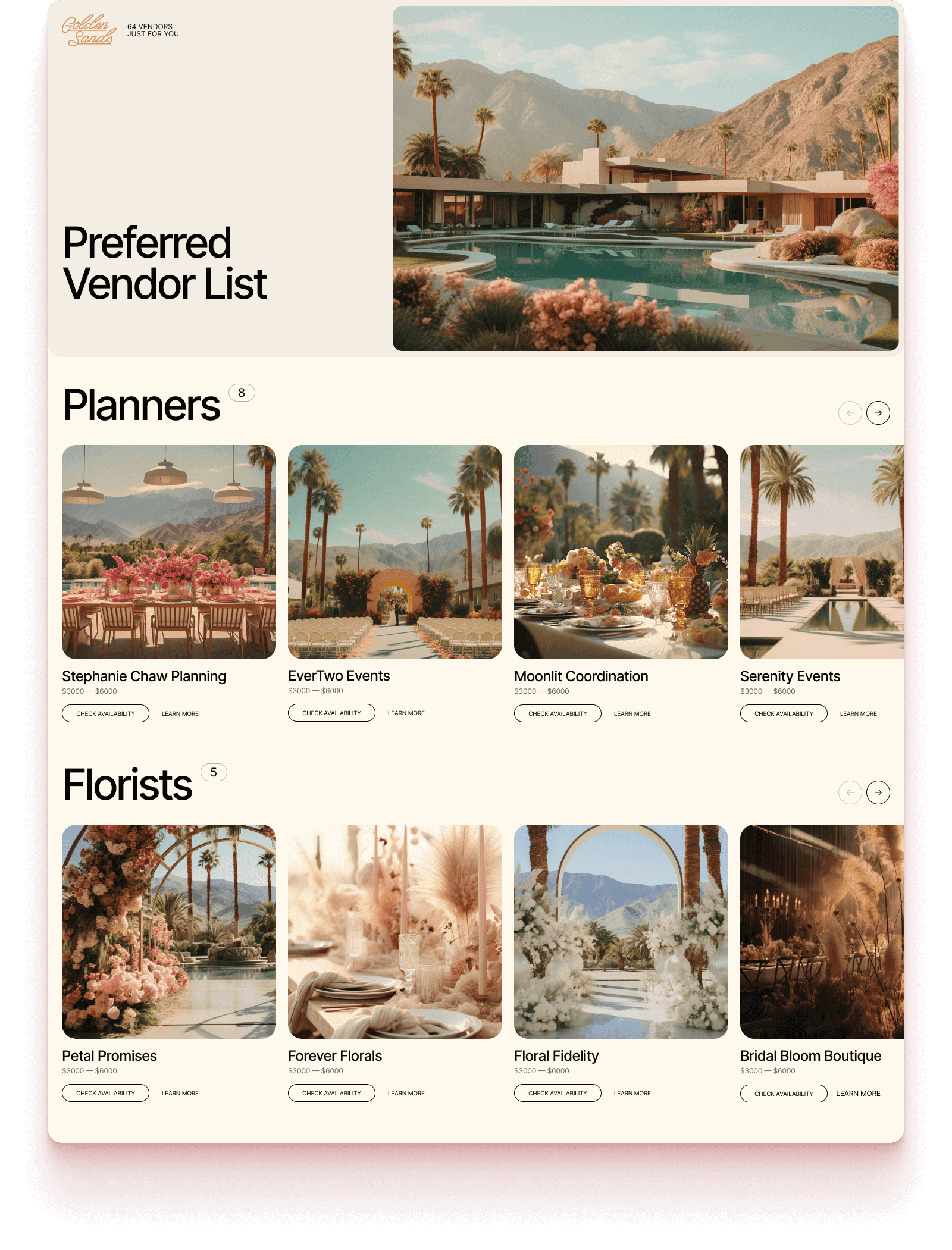 Couples can see budget expectations at a glance, check availability with one click, and mark vendors as booked.