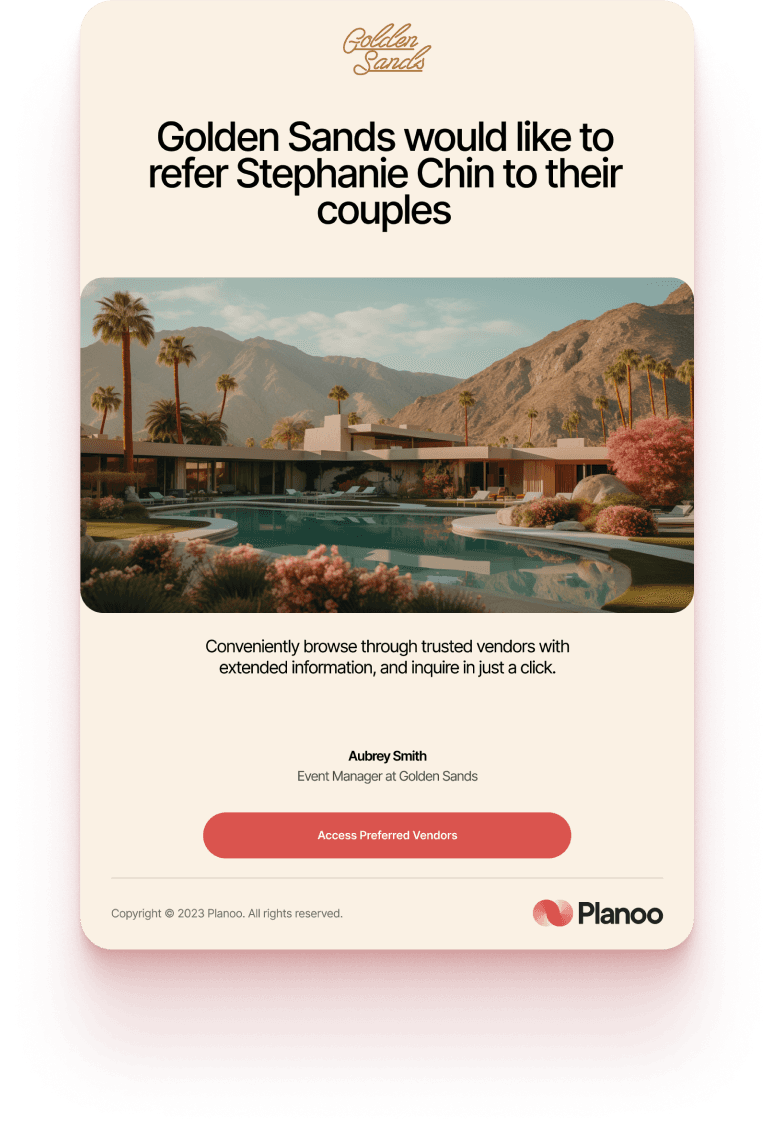 Using Planoo has enhanced our venue offering, directly connecting clients with our preferred vendors in a sleek, digital format. The platform is praised for its ease of setup and use by both our team and clients. Additionally, being able to see which vendors are popular and which are slower to respond has been great in improving our list.